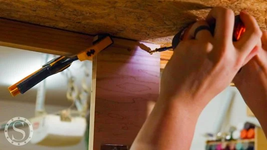 Since I’m mounting everything underneath overhead storage, I could secure the locking mechanism directly to the front of it. If you mount panels to the ceiling, you must use a solution similar to the Top Mount. Mount a board to the ceiling into studs or drywall anchors. Then, install the mechanism on the board with pocket holes.