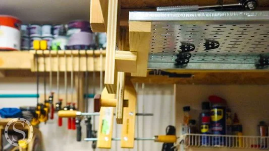 If you are like me, I have my Hanging Wall Control Panels hanging from my garage overhead storage. If you are installing it on a ceiling, install it into studs or drywall anchors. The top mount should be installed in overhead storage with wood glue and brad nails. Then, install the Top Offset assembly to the Top Mount with wood glue and pocket hole screws. Make sure to center the assembly before driving in the pocket hole screws.