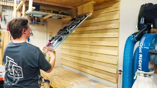 Working in a small shop or workspace can be challenging. One of the biggest challenges that is essential to tackle is organization. These hanging, hinged Wall Control panels add half a wall to my tool wall by utilizing wasted space above my workbench.