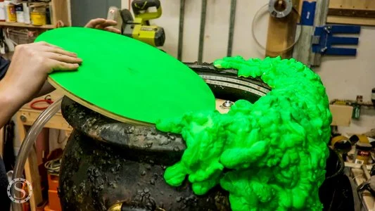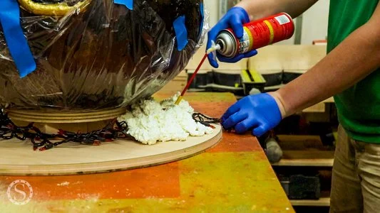 Add some plastic wrap to the bottom of the cauldron to protect it from the foam, then place the cauldron on the small circle. Add more expanding foam, again in vertical paths, so it covers the lights and the entire base. You’ll also want to let the foam expand up onto the cauldron.