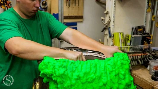 Use the spray foam insulation to add the skull. I found that having the foam be more vertical than horizontal made it look like poison was flowing over the rim. Add the foam everywhere within the outline. For the detail gaps on the inside, try to creep up on the line so you don’t have to make too many adjustments.
