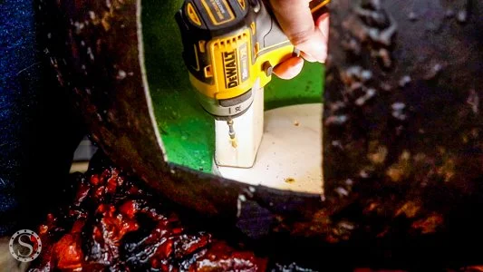 Install 2 of the legs on either side of the panel opening toward the back using at least two screws in each leg. Zip the drill to the third leg, place the assembly in the cauldron, add the bottom circle, and center it. Insert part of the threaded rod offcut through the hole and into the drill. Mark where the leg needs to go so that everything is aligned. Remove the rod and bottom circle, then install the final leg with several screws.