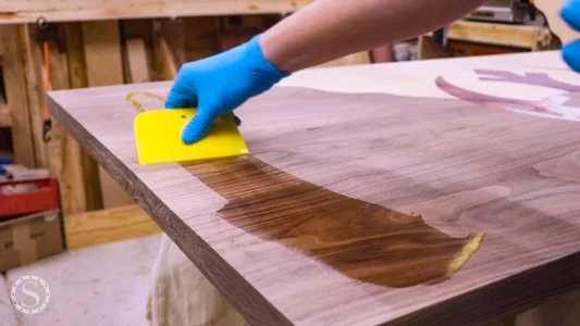 After a few days of cure time, the epoxy was ready to be cleaned up. I removed the hot glue and then spent a reasonable amount of time sanding everything down to 320. I wanted this desktop to be extremely smooth. While I didn’t film the sanding, it’s better to take your time here and get it right than run into issues with the finish.