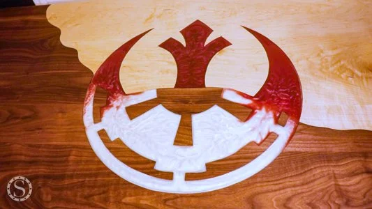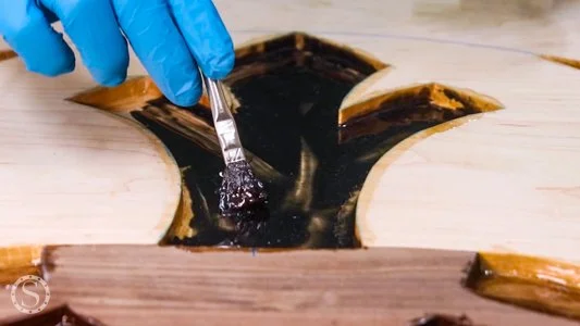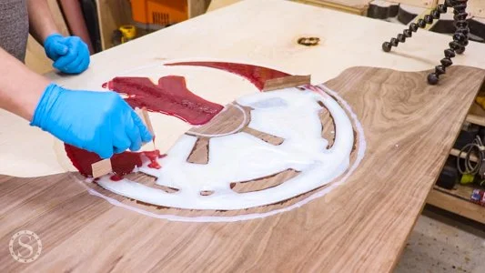 Thanks to a recommendation from Kimani (vanstraydesigns on Instagram), I used penetrating epoxy to seal the inside of the logo. I added black mica pigment to the penetrating epoxy for the maple side to help the red color really pop later.
