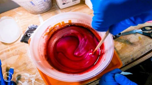 The epoxy pour was by far the most nerve-wracking step. I prepped my epoxy pour in 2 buckets, adding some white mica pigment to one bucket and red to the other.