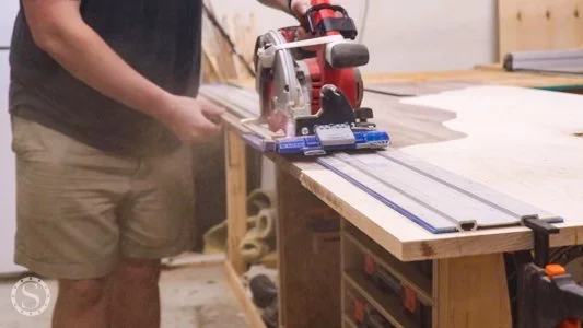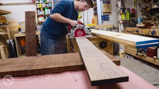 After the glue dried for a few days and I sanded everything down to 120, I marked and cut the desktop to its final size. I kept the offcuts for the sides and front so I could flip them over and glue them to the bottom. The offcuts make the desk look thicker without the whole thing needing to be that thick.
