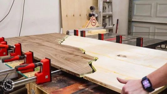 Then, I put the dowels in and glued up the boards using some of the longest clamps I had. I also did all of these steps for the maple boards.