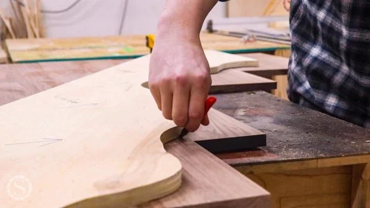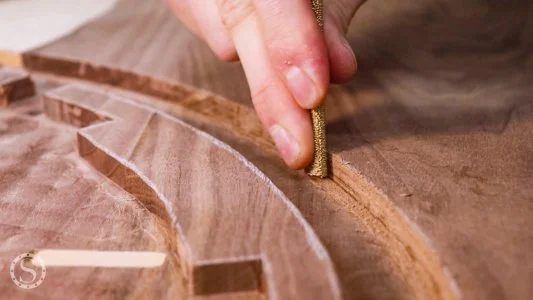 Since I routed the logo by hand, I returned with a chisel, wood rasp, and sandpaper to clean up the logo inlay. I am thrilled I did this and didn’t assume that my router work was perfect, although it did take quite a while to finish.