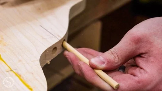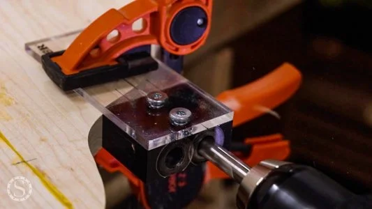 I decided to add dowels to the glue-up for added strength and to help with alignment. I started with the walnut boards, drilling the holes with my doweling jig.