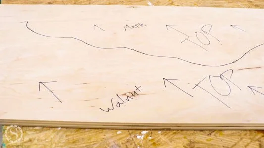 While the glue dried, I pulled out a large offcut of plywood to use as a template for the curve. I marked the curve I wanted and used my jigsaw to cut the curve out in a single pass. The single pass is essential so the pieces go back together as perfectly as possible later. I also clearly marked which side of the curve went with each panel.